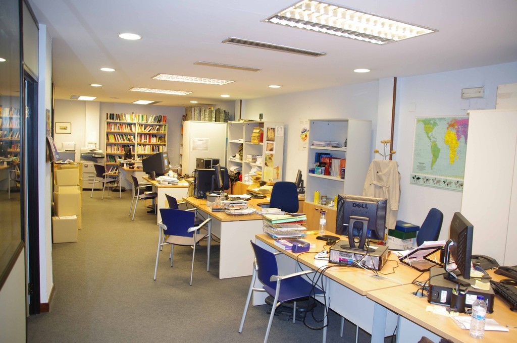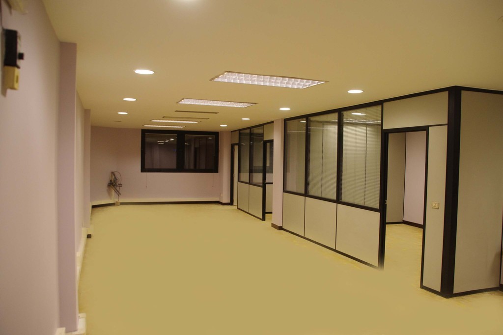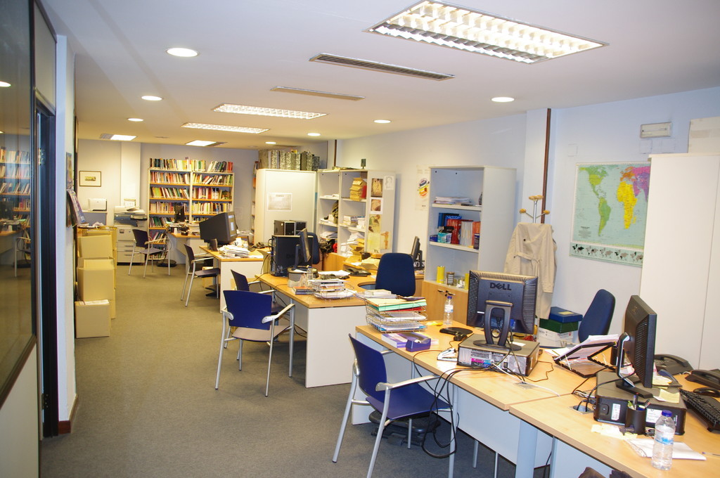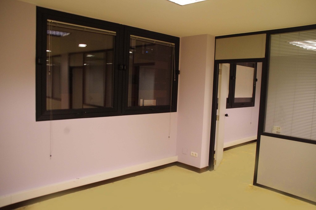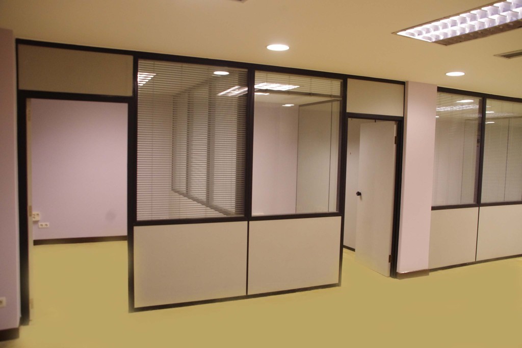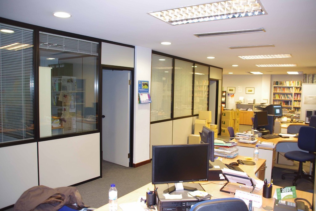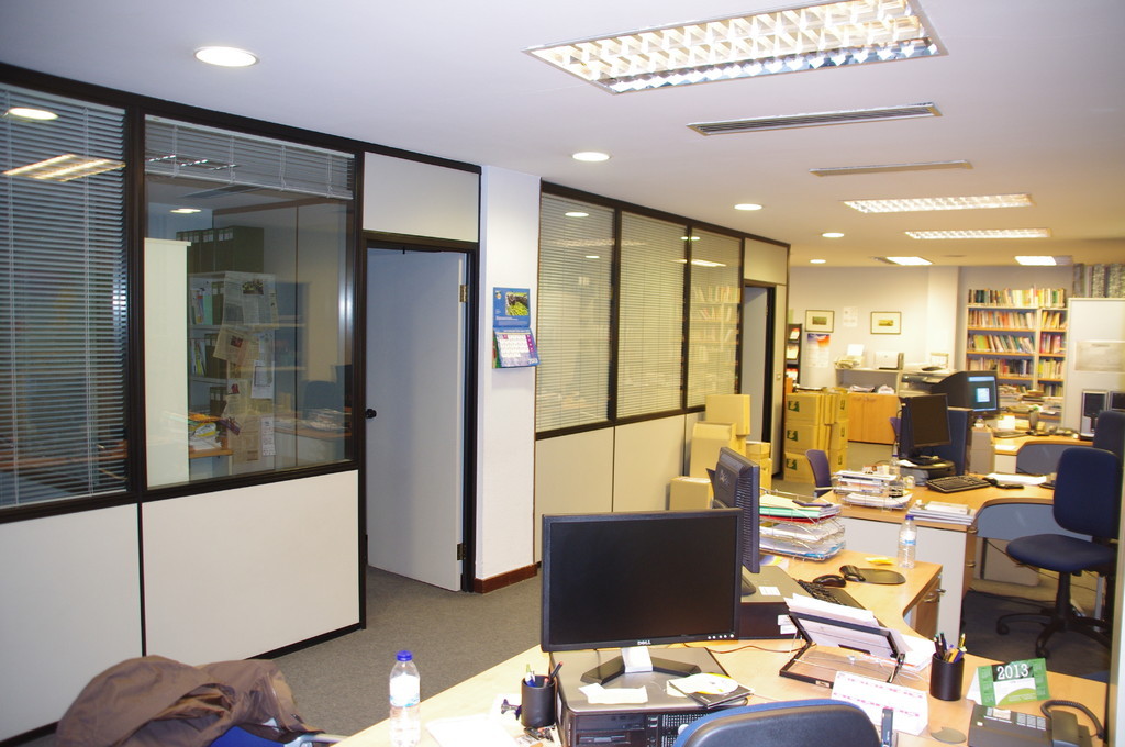Dividida con mamparas; dos despachos, sala de reuniones y zona común.