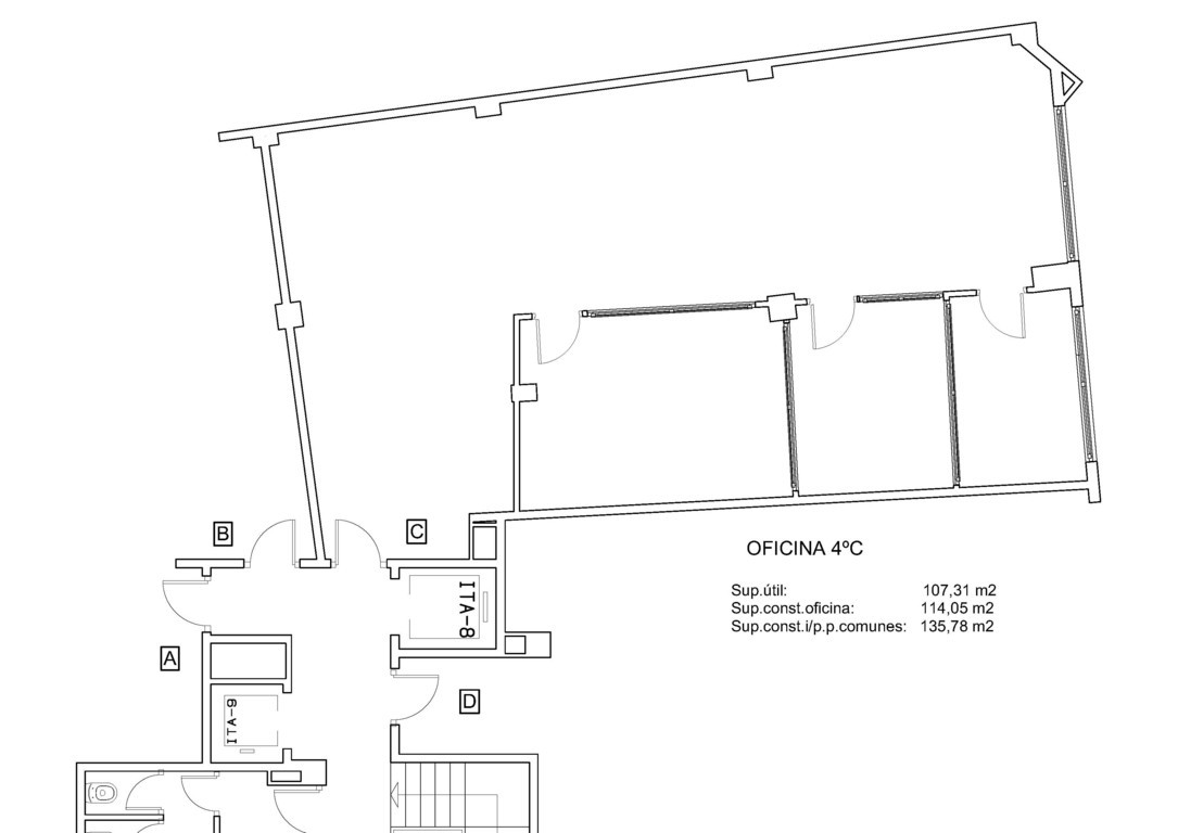 Superficie útil: 107,31m2; superficie construída en oficina: 114,05m2; superficie construída con partes comunes: 135,78m2.