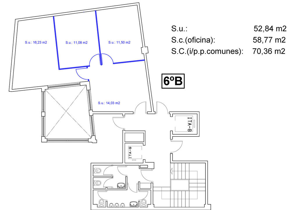 Superficie útil: 52,84 m2; superficie construída en oficina: 58,77 m2; superficie construída con partes comunes: 70,36 m2. Aseos comunes.