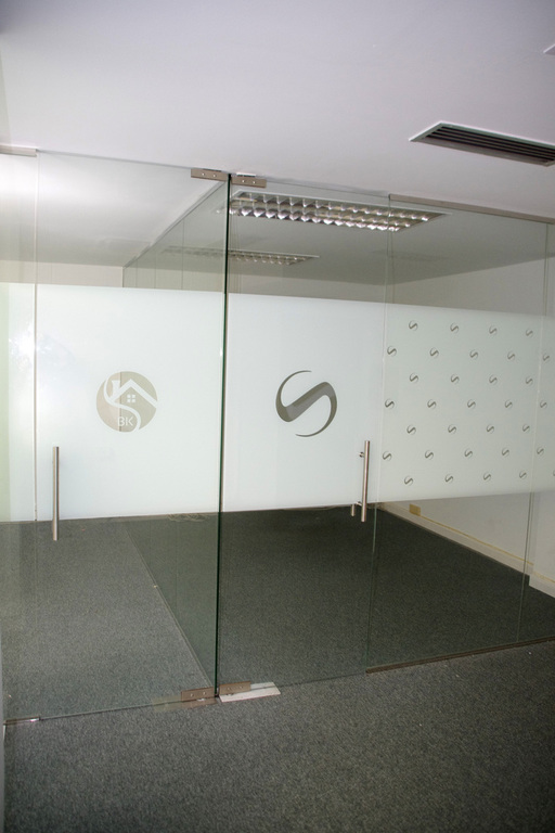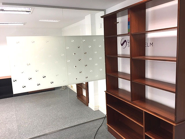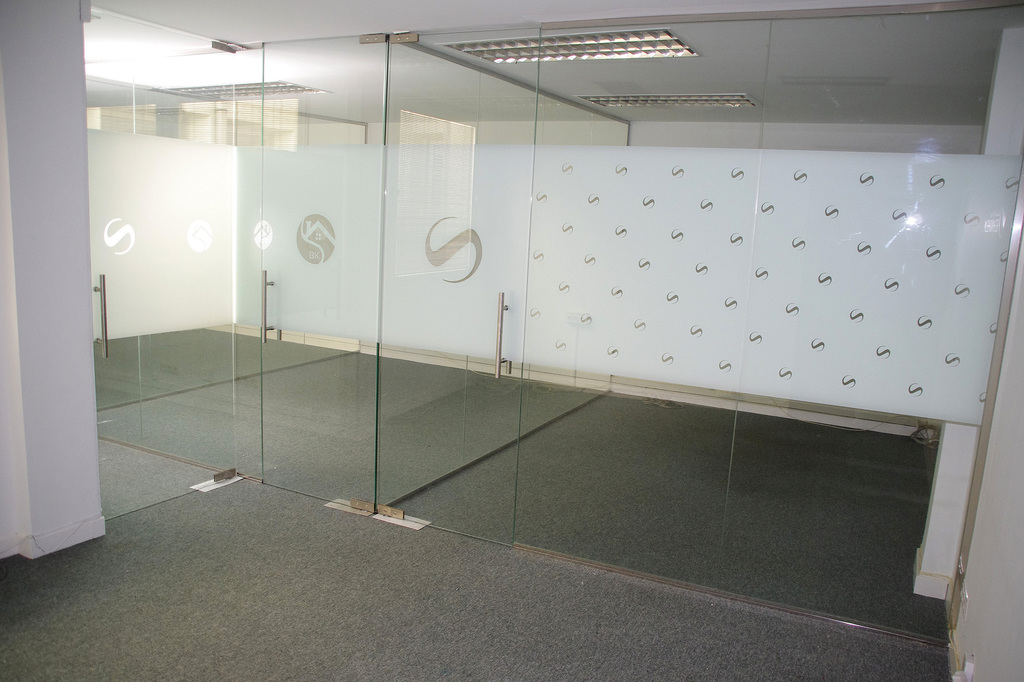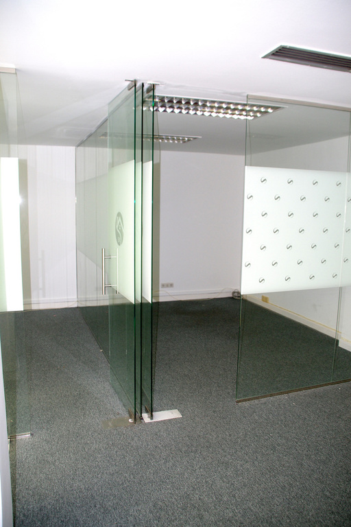 Distrubuida con mamparas de vidrio en zona de recepción y tres despachos.