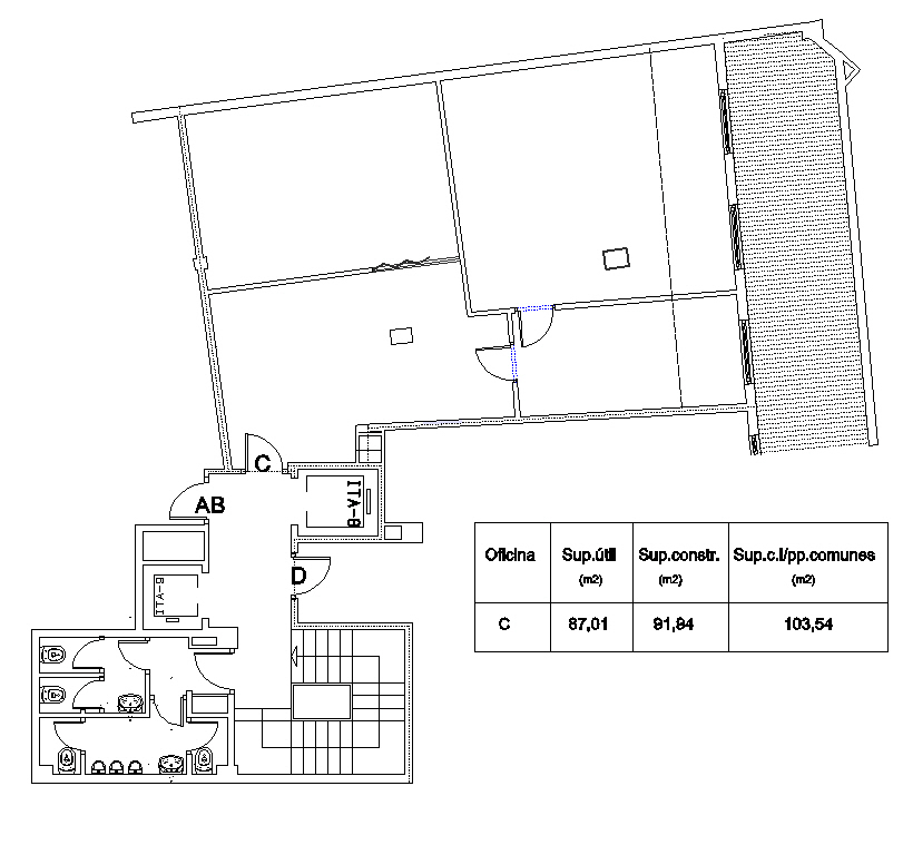 Superficie útil: 87,01 m2; superficie construída en oficina: 91,94 m2; superficie construída con partes comunes: 103,54 m2.